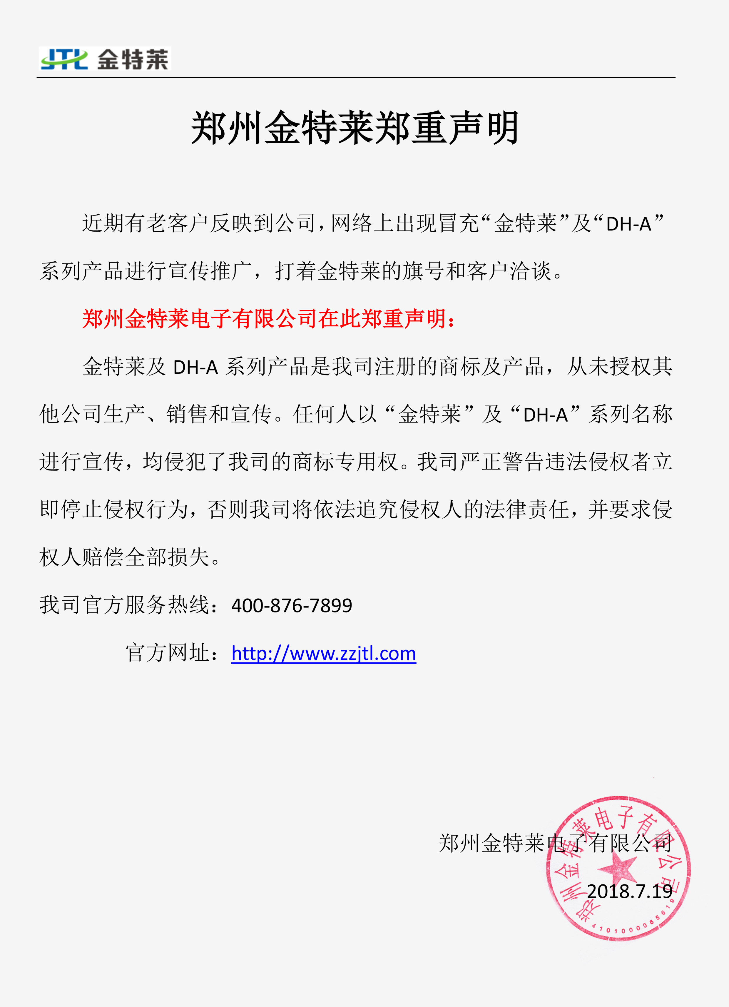 鄭州金特萊電子有限公司在此鄭重聲明: