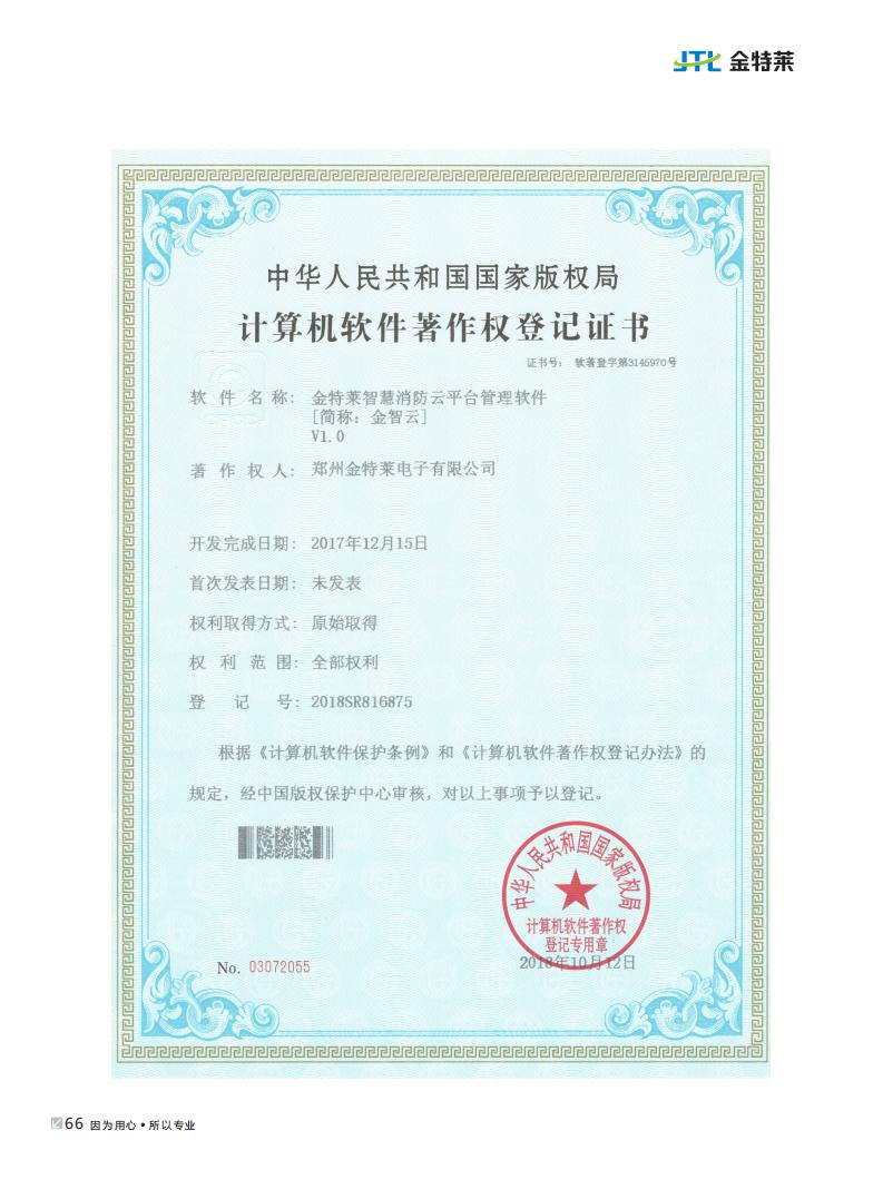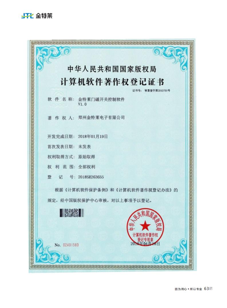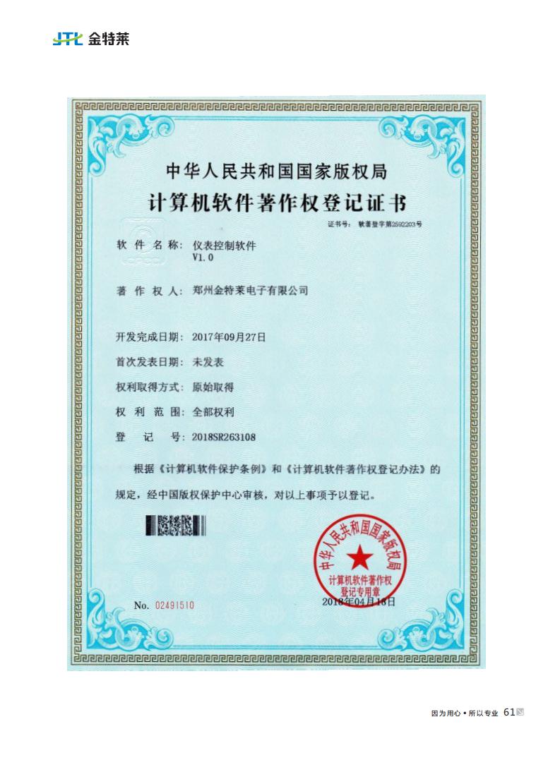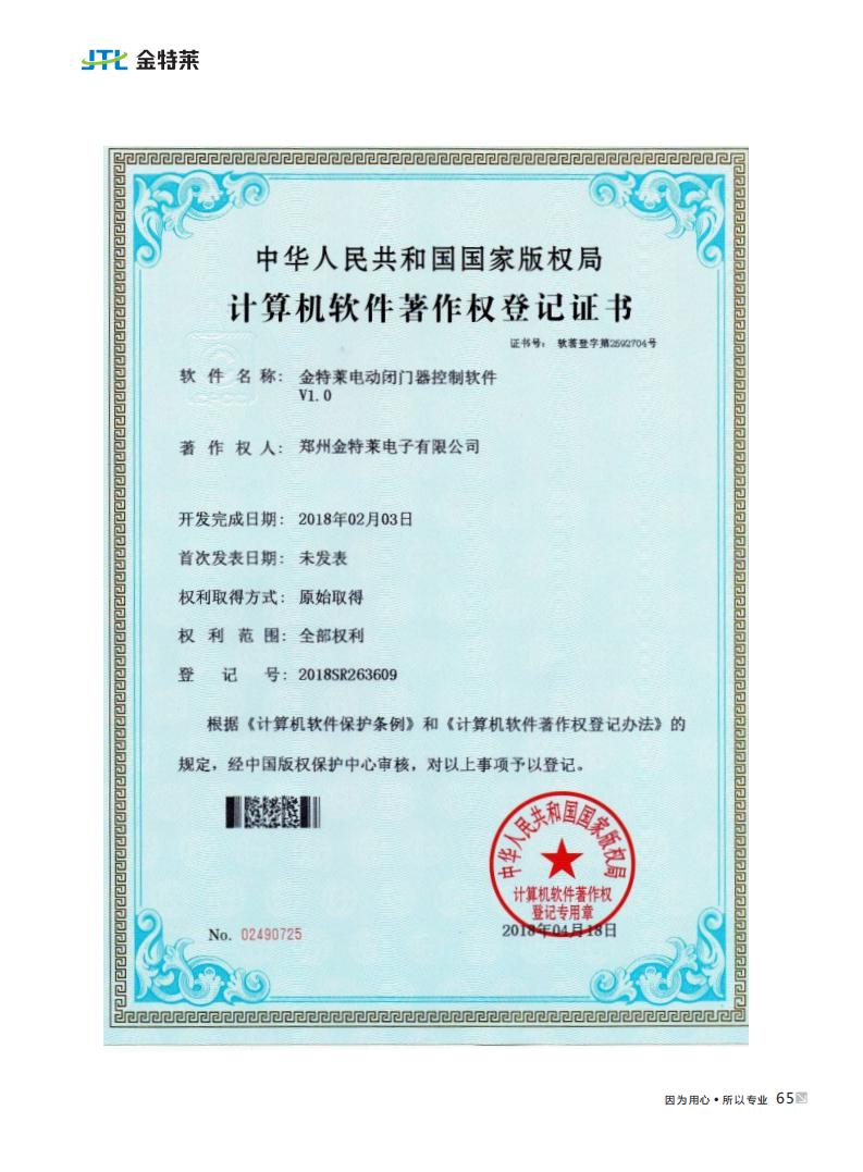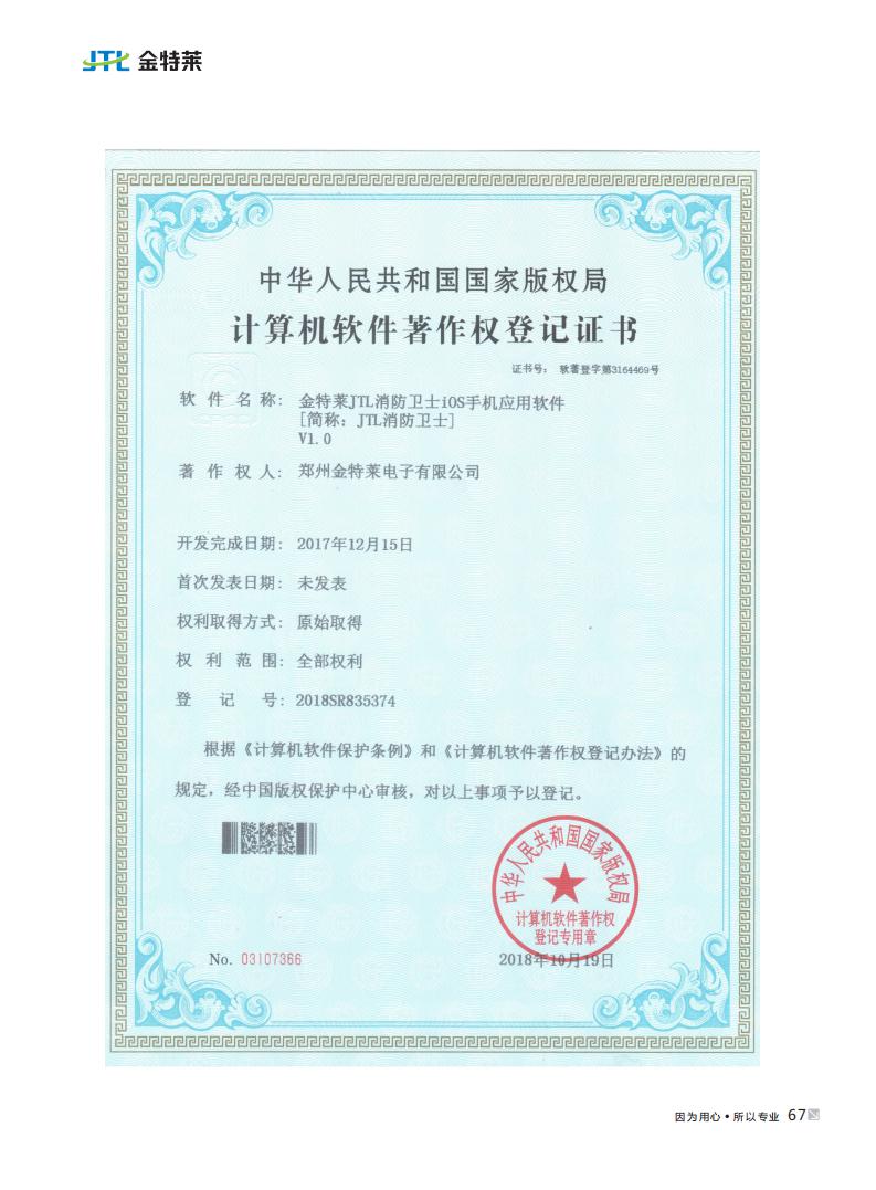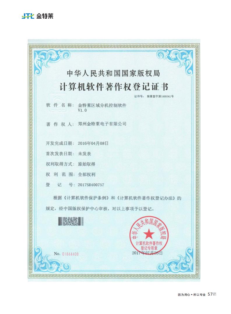 ? ? ?? 鄭州金特萊的智慧用電和智慧消費產品都獲得了計算機軟件著作權登記證書。
